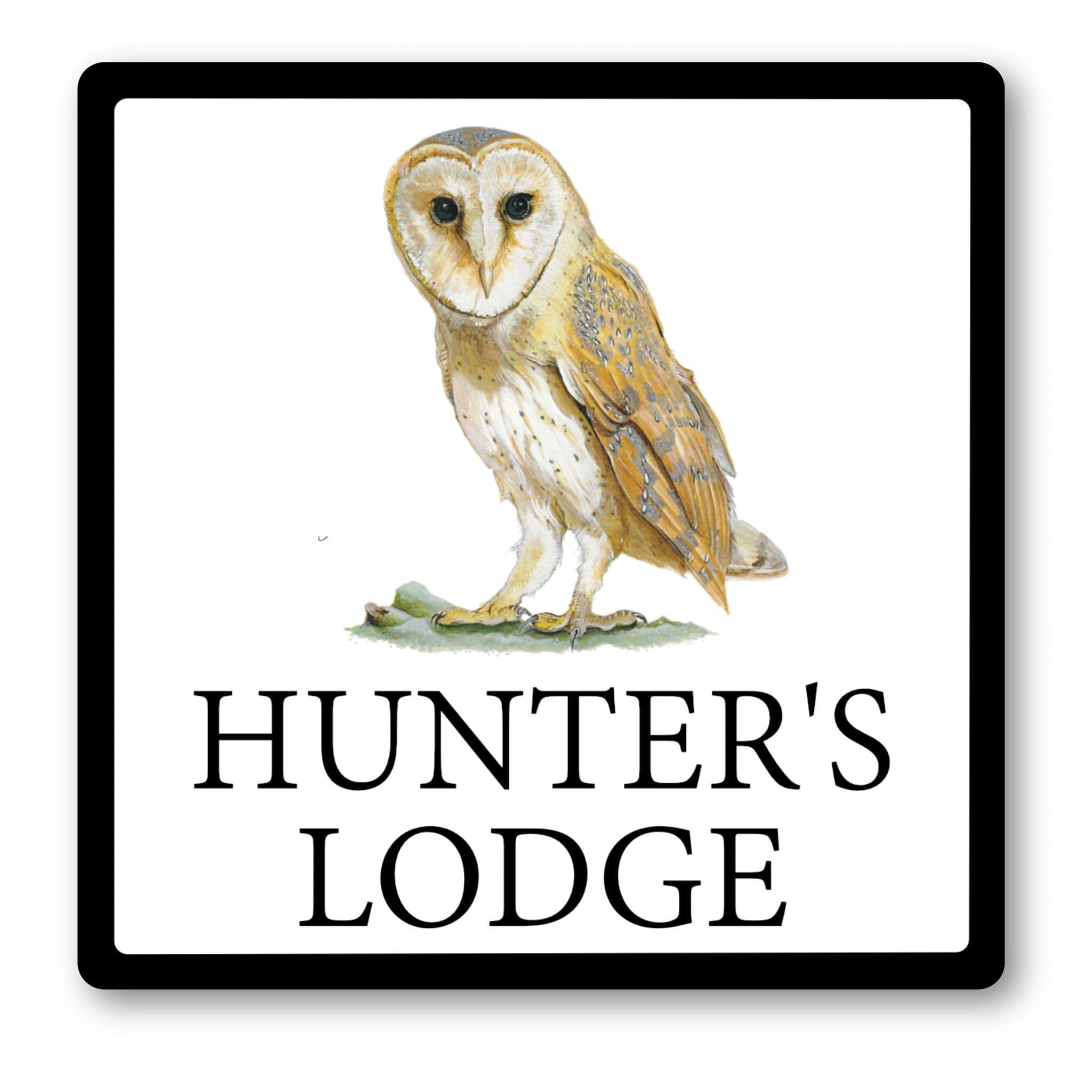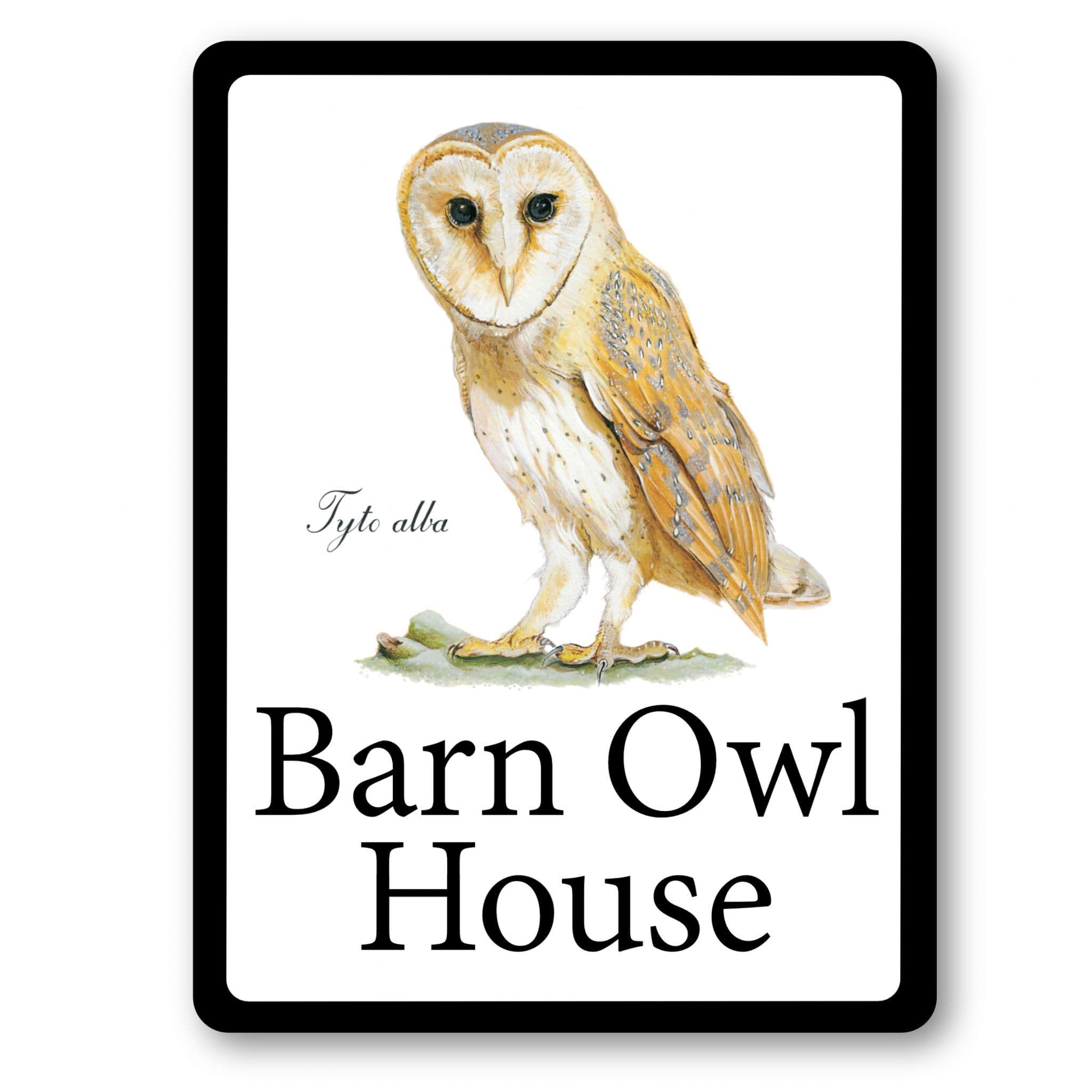 The barn owl house sign from Selene Signs is available in either round or rectangular format. It uses white glossy HD aluminium for great colour reproduction, is weatherproof, fade resistant and comes with a five-year guarantee. Our signs are printed by dye sublimation, which means the image is absorbed into the surface of the aluminium rather than sitting on it and doesn't flake or peel off.