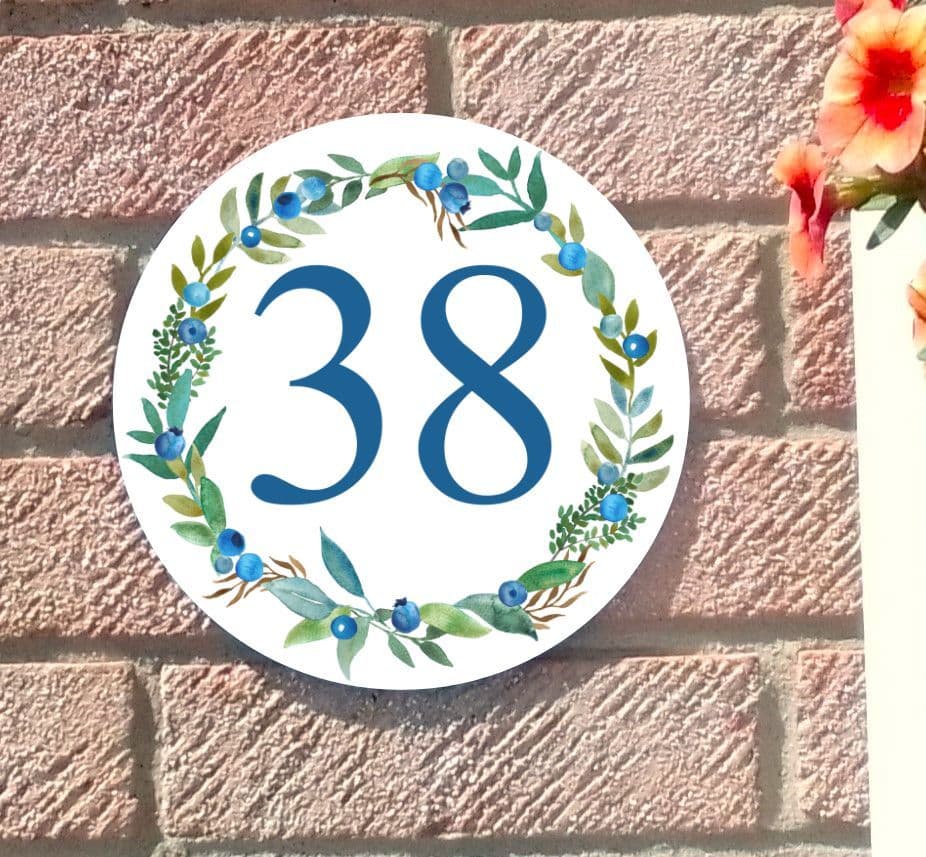 Our Blueberry house or cottage sign features a stunning watercolour blueberry image by Sandra Hermans, who specialises in seasonal fruits, flowers and country scenes. It will be perfect for nature lovers, gardens, kitchens, or for anyone who wants a splash of blue to brighten their front door. The Blueberry sign is available in a circular format, either 20 cm or 25 cm diameter, or four rectangular sizes: 10 x 15 cm; 15 x 20 cm; 18 x 24 cm or 21 x 28 cm. There's also the option of a circular wreath, with the number or name in the middle of a decorative border - please let us know if you'd like that design.