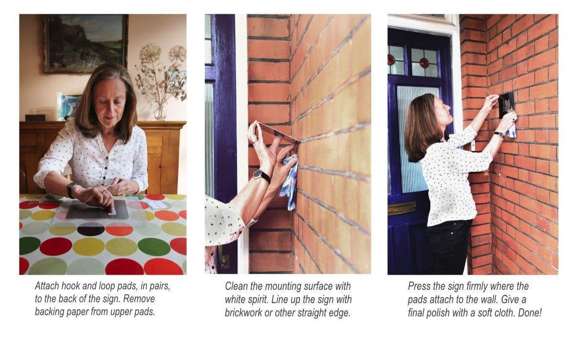 Mounting: No DIY skills are required to put up your sign, nor ugly screws that spoil the design. We supply Velcro pads* that will stick to most flat or slightly bumpy surfaces, such as wood and brick.